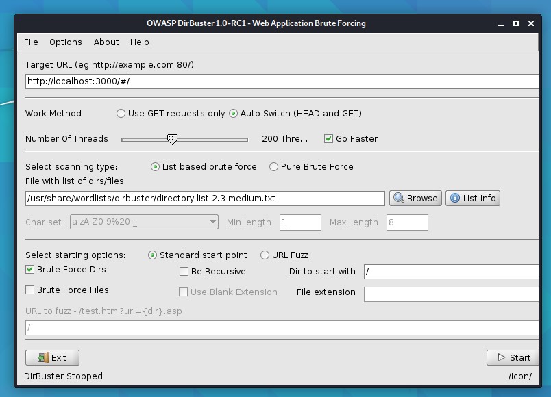 Reading the expanded description in the guide, I was pointed to the section titled “Finding the Score Board”. There, one of the hints strenuously suggested that this link was easily guessable. That’s great and all, but it makes for a terrible walkthrough, so instead I fired up Dirbuster and prepared for the onslaught of errors I knew would be coming. For some reason Dirbuster and Juice Shop on Docker don’t always get along with one another particularly well, which is unfortunate, as it’s a very easy tool to use. Despite this, I had nothing to lose by trying it again.