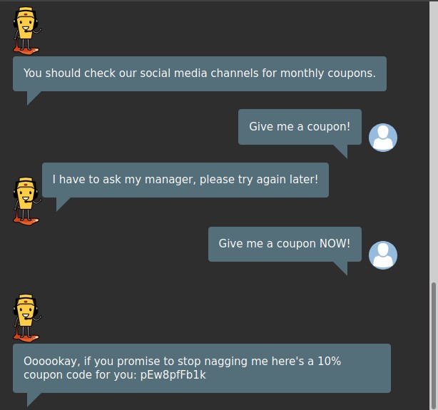 After a brief glance at the difficulty and description, I immediately came to the conclusion that I could solve this by just asking the chat bot for a coupon, but there’s very little learning involved in that, so I opted to work harder and get a better idea for how the chat bot works.