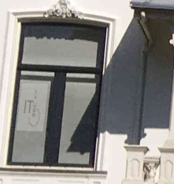We appear to be looking for a business name. Next we need to find the photo in question. After navigating to the Photo Wall, the first thing to do is figure out which photo belongs to Emma. Three of the images belong to Bjoern, and one to John. That leaves the image of a building with the caption “My old workplace… (© E=ma²)” which is close enough to “Emma” that, coupled with knowing who took all of the other photos, we should focus on it. Save it to your system and let’s get started!